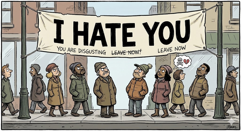 12월의 영등포 거리, 신호 대기 중 마주친 붉은 현수막은 시각적 폭력 그 자체였다. "집값도 못 잡아... 폭망 대책 철회하라!" 원색적인 배경 위에 굵은 고딕체로 박힌 저주 섞인 문구들이 행인의 시선을 강제로 낚아챈다. 정책에 대한 비판이라기보다는 배설에 가까운 혐오의 언어들이다.